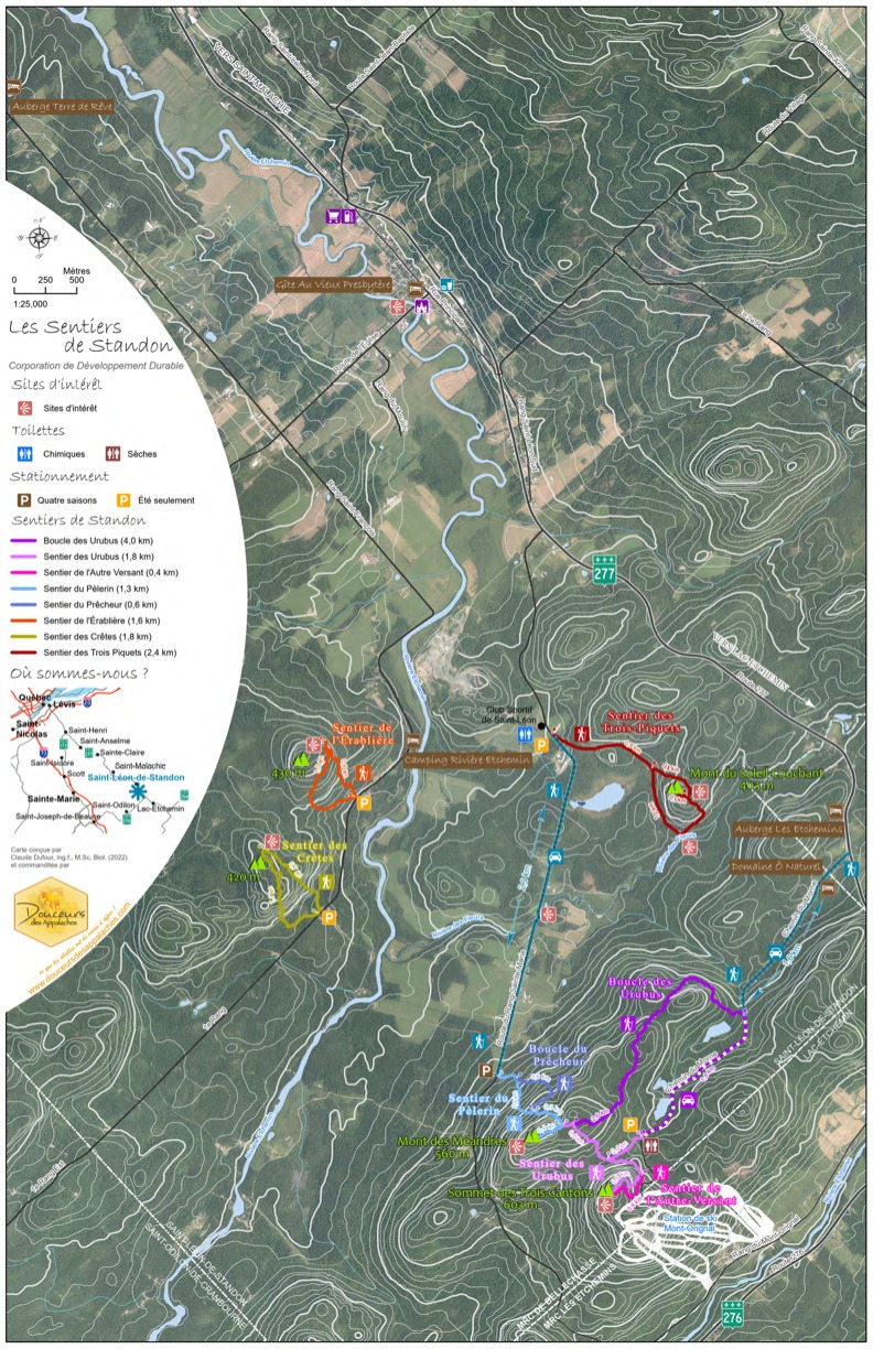 Télécharger la carte des sentiers pédestres ou visiter le site de Balise Québec.